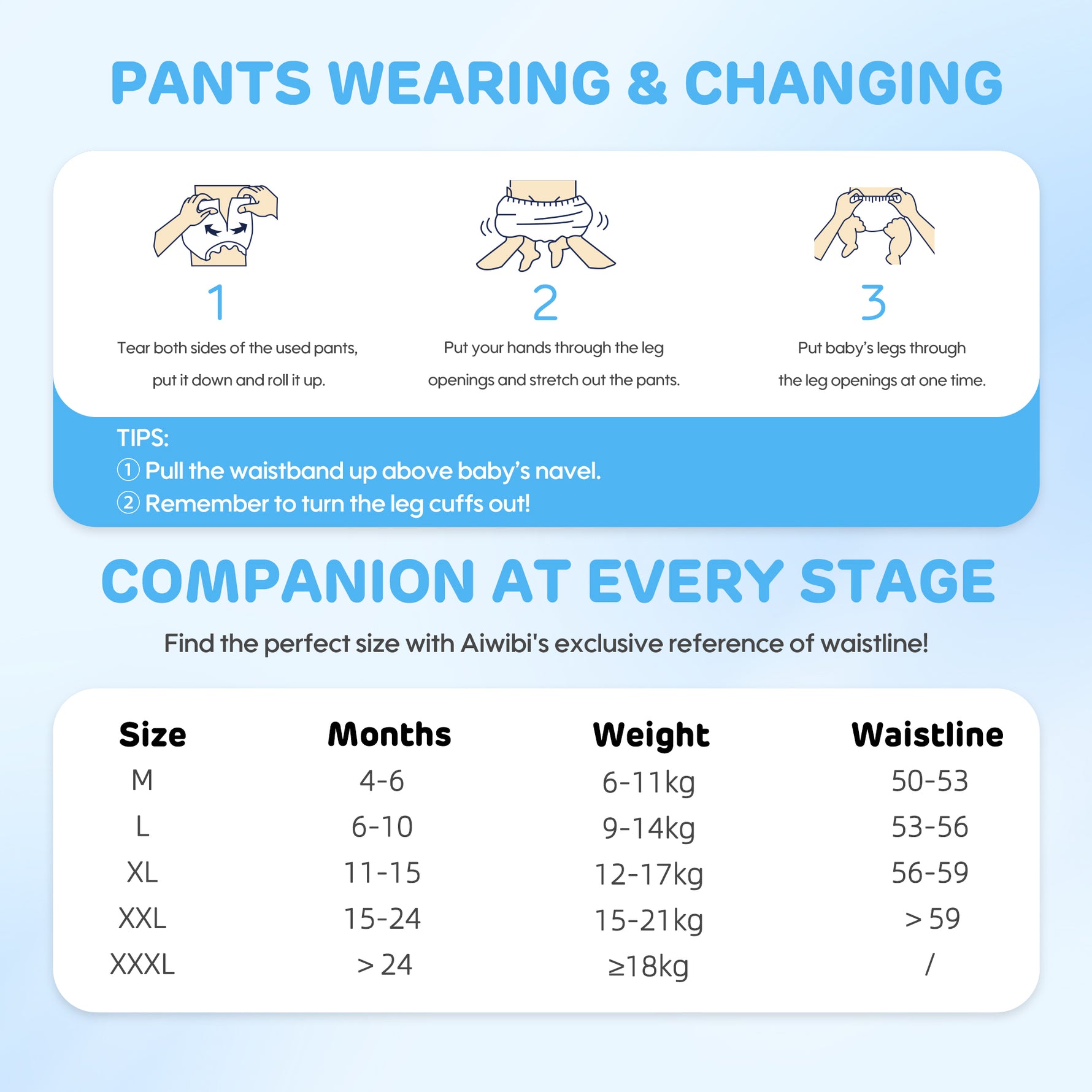نطاق الوزن على عبوة الحفاضات هو مجرد إرشاد. إذا كانت الحفاضة كبيرة جدا، قد يتسبب ذلك في التسرب. على سبيل المثال، قد تناسب الحفاضة فخذ طفلك بشكل جيد، ولكن إذا كان هناك فجوة في منطقة الفخذ، فإن البول لن يتم